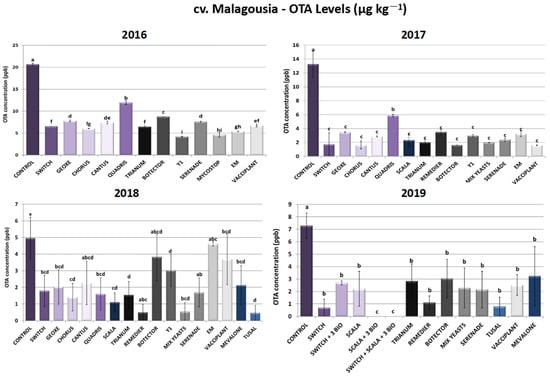 Ochratoxin A levels (μg kg−1) produced by Aspergillus carbonarius in cv. Malagousia after PPP treatment of vines in the years 2016–2019. Statistical analysis was performed using one-way ANOVA followed by Tukey’s multiple-comparison post hoc test (p < 0.05). Letters above the graphs indicate differences between treatments.