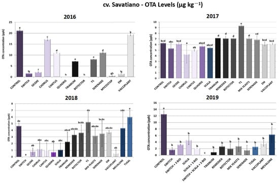 Ochratoxin A levels (μg kg−1) produced by Aspergillus carbonarius in cv. Savatiano after PPP treatment of vines in the years 2016–2019. Statistical analysis was performed using one-way ANOVA followed by Tukey’s multiple-comparison post hoc test (p < 0.05). Letters above the graphs indicate differences between treatments.