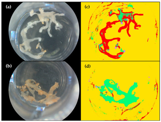 Figure 1. Example of the application of the necrosis analysis model on microcalli D6 after treatment with water or with fungal filtrates of modality A. (a,b) Images of microcalli treated with water (negative control) and filtrates of modality A (fungus–broomrape interaction) respectively after standardization step; (c,d) Images of the same wells after application of the classification model. Necrotic microcalli are shown in green, healthy ones are in red, seeds are in purple, and the background is in yellow.