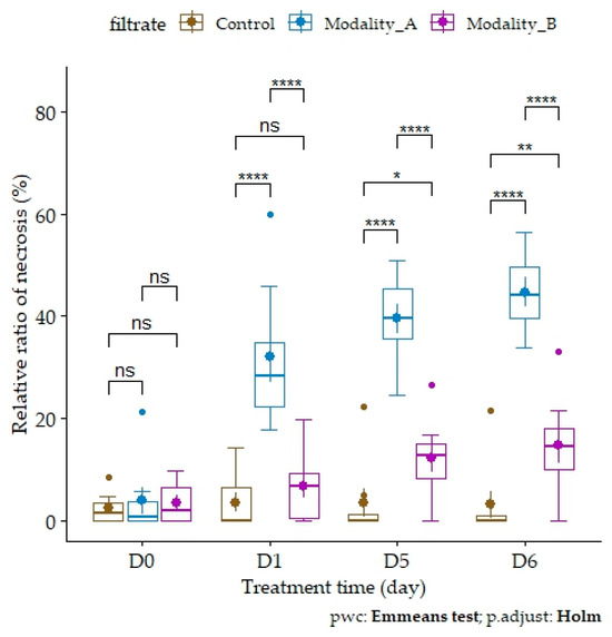 The results of the image analysis are consistent with these observations, underlining the relevance of the method used (Figure 1). ANOVA on quasi-logistic regression showed a significant effect of filtrate (p-value < 2.2 × 10−16) and treatment time (p-value = 6.919 × 10−12) but not of the interaction between these two factors (p-value = 0.2326). Multiple comparisons for each factor (“filtrate” and “treatment time”) were performed. The rate of necrosis was significantly different between the filtrates (Table 1). For the “treatment time” factor, the only significant differences in the percentage of necrosis were observed between D0 and D5 (adjusted p-value = 5.57 × 10−3) and between D0 and D6 (adjusted p-value = 1.06 × 10−3).