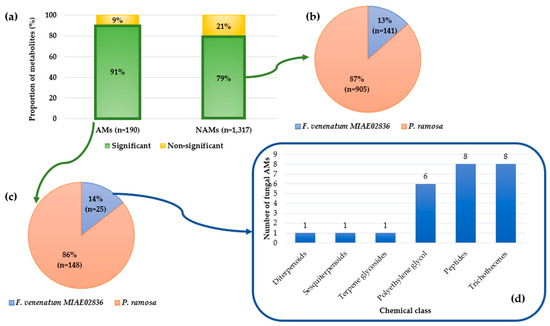 Figure 3. Results of metabolomic data analysis (ESI+ mode) for AMs and NAMs. (a) Proportion of metabolites with relative abundance significantly and non-significantly different based on ANOVA by permutation; (b,c) metabolites with relative abundance significantly different distributed according to their origin of production (F. venenatum MIAE02836 or P. ramosa) for NAMs and AMS respectively. The origin of production was supposed after a simple comparison between the normalized means of the relative abundance of the metabolites produced by the fungus alone (modality B) and by the broomrape alone (modality C); (d) distribution by chemical class of annotated fungal metabolites with relative abundance significantly different.