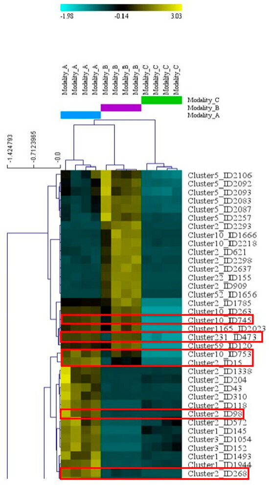 Figure 4. Accumulation of AMs with significantly different relative abundance by modality (broomrape alone, fungus alone, and interaction) (ESI+ mode). Part of the hierarchical tree showing metabolites with relative abundance significantly different between modalities A (broomrape–fungus interaction), B (fungus alone), and C (broomrape alone) according to the one-factor ANOVA by permutation (1000 permutations, p-value < 0.01) using MeV 4.9.0 software. The basal normalized relative abundance is shown in black. When the gradient tends towards yellow, the metabolite is accumulated to a greater extent. When the gradient tends towards blue, the quantity is lower. Metabolites framed in red correspond to fungal metabolites accumulated during interaction (see Table 2).