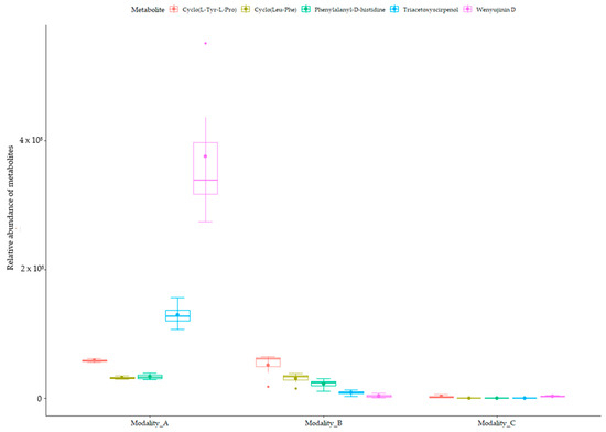 Figure 5. Mean relative abundance of fungal metabolites accumulated during the interaction with broomrape. Boxplots are shown with means (bold stars) and standard errors of the relative abundance of the fungal peptides and sesquiterpenoids accumulated during the interaction. Anguidin has not been represented, as it is heavily produced (minimum relative abundance of 329,458 metabolites and 2,442,767 metabolites for the fungus alone and for the interaction, respectively). Modality_A: filtrates from fungus–broomrape interaction; Modality_B: filtrates from fungus alone; Modality_C: filtrates from broomrape alone.
