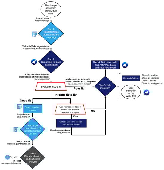 To date, tests of fungal metabolites or suspension on P. ramosa have mainly been carried out in Petri dishes for germination and co-culture for plant development [25,26,27,28]. Due to the microscopic size of P. ramosa seeds, the usual Petri dish tests, with counting under a binocular magnifying glass, are long, tedious, and unsuitable for large sampling plans. Co-cultures take a long time to set up and reveal the complexity of the tripartite relationship between the parasitic plant, the host plant, and the pathogen [2,28]. The culture of broomrape calli, developed by Fernández-Aparicio et al. on P. aegyptiaca, is an innovative method [29]. The adaptation of this culture system in 96-well plates [30,31,32] offers interesting features: (i) cultivation of the parasitic plant in the absence of the host is made possible by the use of a sucrose-concentrated culture medium; (ii) production is rapid (three to four weeks) and in a sterile environment; (iii) a large number of samples are available (96 wells per plate), which facilitates metabolite screening during phytotoxicity tests. Fungal filtrate-induced necrosis can be observed under the microscope, but the analysis remains mainly qualitative. Computerized image analysis can bypass most of the biases due to human observation and has become an essential tool in disciplines such as biology [33]. Recently, a high-throughput phenotyping tool for seed germination in 96-well plates was developed [34]. Image acquisition from the wells was automated, and the transferred data were analyzed by machine learning using sprouted seed scoring, which augured thousands of samples to be explored accurately, rapidly, and repeatedly.