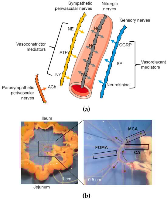 Functional organization of perivascular innervation of mesenteric arteries. (a) Schematic representation of periarterial innervation. Neurotransmitters are released from varicosities and diffuse to receptors in SMCs and ECs. CGRP = calcitonin gene-related peptide; NE = norepinephrine; NY = neuropeptide Y; SP = substance P. Galanin is not shown since it has not been detected in nerve fibers of mesenteric arteries. (b) Image of mesenteric arterial bed in mice. Three different branches were used: cecocolic artery (CA; diameter = ~200 µm), middle colic artery (MCA; diameter = ~150 µm), and first-order mesenteric artery (FOMA; diameter = ~150 µm). Red arrow illustrates blood flow.