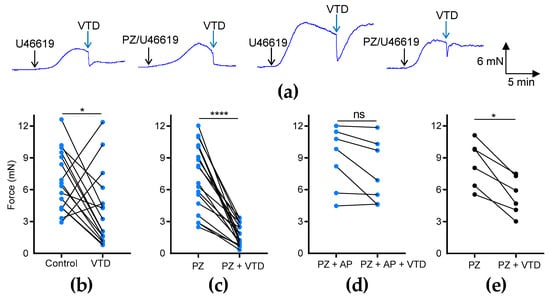 Effects of VTD on CAs and MCAs. Wall tension generated by CAs and MCAs was measured with and without PZ (1 µM). (a) Examples of myographic traces showing effects of VTD (30 µM) on CAs. (b–e) Graphs illustrating connected scatter plots of individual values of wall tension levels (force, in mN) before and after VTD application for each CA (b–d) and MCA (e). Control: wall tension with U46619 alone; PZ: wall tension with U46619 with PZ; PZ + AP: wall tension with U46619, PZ, and atropine (AP, 100 nM). CAs were isolated from male (n = 9) and female (n = 7) mice (b,c). Only male mice were used in (d) (n = 7) and (e) (n = 6). Significance was evaluated using paired t test: *: p < 0.05; ****: p < 0.0001; ns: non-significant; p = 0.0602.