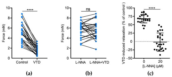 The effects of L-NNA on VTD-induced vasorelaxation in CAs. (a,b) Connected scatter plots showing the contractile force (in mN) generated by isolated CAs before and after the application of VTD (30 µM) in the absence of L-NNA (a) and in the presence of 20 µM L-NNA (b). (c) Scatter plots illustrating the reduction in VTD-induced relaxation (in %) by L-NNA. All experiments were carried out on pre-contracted CAs with U46619 in the presence of PZ (1 µM). The CAs were isolated from male (n = 16) and female (n = 10) mice. The significance was analyzed by a parametric paired t test (****: p < 0.0001; ns: non-significant; p = 0.8193).