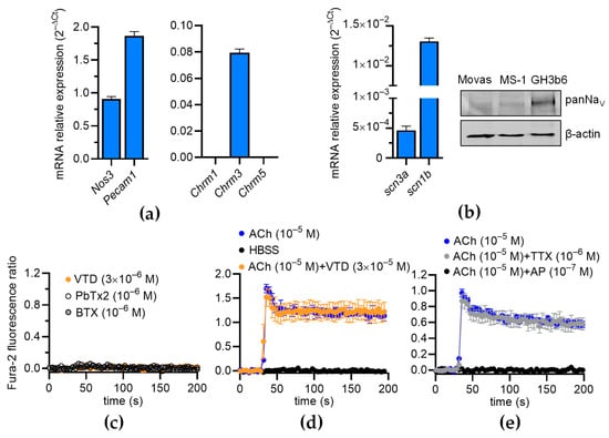 Effects of VTD on intracellular Ca2+ concentration in MS1 ECs. (a,b) RT-qPCR data, illustrated as RNA relative level (2−ΔCT), showing expression of nos3, pecam1, chrm1-3, scn3a, and scn1b. Undetectable genes are not represented (scn1a, scn2a, scn4a, scn5a, scn8-11a, scn1-2b, and scn4b) (b) Western blot (right panel) illustrating NaV channel expression in MS1 ECs. Western blot was performed with 30 µg of proteins. PanNaV and β-actin antibodies were used. GH3b6 cells were used as positive control. (c,d) Example of kinetic traces of Fura-2 fluorescence–emission ratio obtained before and after injection, at 30 s, of VTD, brevetoxin 2 (PbTx2), batrachotoxin (BTX) (c), and ACh (d,e). Effects of co-injection of ACh and VTD or TTX or AP are shown (d,e). Hank’s Balanced Salt Solution (HBSS) was used as negative control. Data are the mean ± SEM of three independent experiments (n = 3).