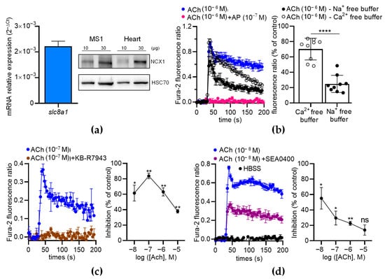 The effects of NCX antagonists on the ACh-induced Ca2+ response in MS1 ECs. (a) RT-qPCR data (left panel) illustrated as the RNA relative level (2−ΔCT), showing the expression of slc8a1, encoding NCX1. The undetectable genes (Slc8a2 and Slc8a3) are not illustrated. The Western blot (right panel) shows the immunodetection of NCX1 in the MS1 ECs. HSC70 antibodies were used as loading controls. Protein extracts from mouse hearts served as positive controls. (b) An example of kinetic traces of the Fura-2 fluorescence–emission ratio, illustrating the effects of ACh (1 µM) co-injected or not co-injected with AP (100 nM), in free Na+ and Ca2+ buffers. The histograms illustrate the normalized emission ratio of Fura-2 measured after Ach injection (1 µM) in Ca2+-free buffer and in Na+-free buffer. These data represent the area under the curve (AUC) calculated from the kinetic traces and after normalization by ACh-induced responses at 1 µM in Hank’s Balanced Salt Solution (HBSS), used as the control. (c,d) The effects of NCX antagonists on the ACh-induced Ca2+ response in MS1 ECs. The left panels show examples of kinetic traces of the Fura-2 fluorescence–emission ratio before and after the injection, at 30 s, of ACh, which led to the highest inhibition induced by the two NCX antagonists KB-R7943 (10 µM) (c) and SEA0400 (10 µM) (d). The graphs on the right panels illustrate the inhibition (% of control) induced by KB-R7943 (c) and SEA0400 (d), as a function of the ACh concentration. HBSS was used as a negative control (d). Data are the mean ± SEM of three independent experiments (n = 3). Statistical significances were determined using the Mann–Whitney test (b) and Wilcoxon test (c,d) (* p < 0.05; ** p < 0.01; **** p < 0.0001; ns: non-significant).