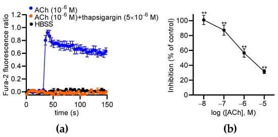 The effects of thapsigargin and chelerythrine on ACh-induced Ca2+ responses in MS1 ECs. (a) The effects of thapsigargin (5 µM) on Ca2+ responses induced by 1 µM of ACh. Hank’s Balanced Salt Solution (HBSS) was used as a negative control. (b) The curves represent the inhibitory effects of chelerythrine (10 µM) on the Ca2+ responses induced by 0.01, 0.1, 1, and 10 µM of ACh in the MS1 ECs. The analyses were based on the area under the curve determined from the kinetic traces. The data were normalized by the Ca2+ response induced by ACh at 10 µM. The mean values of the inhibitory effects were compared to 0% using a one-sample t test (** p < 0.01). Values are means ± SEM (n = 3).