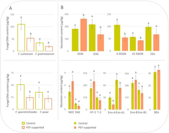 Levels of Fusarium species (A) and relevant mycotoxins (B) in final malts produced from pre-soaked barley without PEF treatment (control) and pre-soaked barley treated by PEF (experiment II). Error bars represent the variability between individual averaged samples; n = 9. Data were statistically processed using a two-sample t-test with unequal variance; statistical differences (p-value < 0.05) are indicated by letters. If the result was not statistically significantly different between the control and PEF-supported sample, both columns are marked with the letter ‘a’. In the case of a statistically significant difference, the PEF-supported sample is marked with the letter ‘b’.