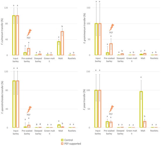 Transfer of mycotoxins produced by Fusarium species used for barley inoculation into the dry matter of intermediates during the production of malt from pre-soaked barley without PEF treatment (control) and pre-soaked barley treated with PEF (during experiment II). The total amount of each mycotoxin in the input barley = 100%. Error bars express the variability between individual averaged samples (n = 9). Data were statistically processed using the two-sample t-test with unequal variance; the statistical differences (p-value < 0.05) are indicated by letters. If the result was not statistically significantly different between the control and PEF-supported sample, both columns are marked with the letter ‘a’. In the case of a statistically significant difference, the PEF-supported sample is marked with the letter ‘b’.