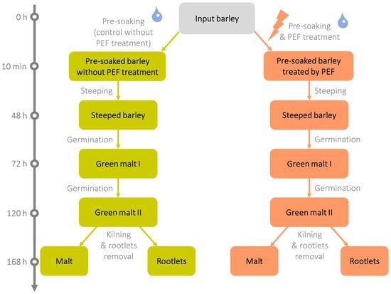 Malting technology and sampling: Malting was conducted using an automatic micromalting system (RAVOZ®, Prague, Czech Republic), which comprises three separate modules for steeping, germination, and kilning. One kilogram of control barley and one kilogram of PEF-treated barley were used for malting. The processing of Pilsen-type malt involved the following steps: steeping for 48 h at 15 °C (8 h steeping, 12 h aeration, 8 h steeping, 12 h aeration, 4 h steeping, and 4 h dripping), germination for 72 h at 15 °C with 95–98% humidity, and kilning for 24 h using a drying air temperature gradient of 45–82 °C (45 °C for 6 h, 50 °C for 6 h, heating from 50 °C to 82 °C for 10 h and 82 °C for 2 h). In experiment I, approx. 100 g of input barley, control, and PEF-supported malt were collected for the DNA assay (Section 4.3) and mycotoxin analysis (Section 4.5) and frozen at −180 °C until respective analysis. In experiment II, approx. 100 g of input barley and each specific intermediate product (i.e., pre-soaked barley, steeped barley, green malt I, green malt II, malt, and rootlets) from control and PEF-treated malting were collected for analysis of DNA (Section 4.3) and mycotoxins (Section 4.5). The schematic of samples collected during malting is shown in Figure 5. For transcriptomics (Section 4.4), only the input barley and green malt II from PEF-treated and control variants were collected in amounts of 20 g. All samples collected were immediately snap-frozen in liquid nitrogen, homogenised using a cryogenic laboratory mill (IKA A11 basic, Verkon, Prague, Czech Republic), and then stored until further analysis (at −80 °C for DNA and mycotoxin analysis and at −180 °C for transcriptomics). The dry matter content of each sample was determined using a halogen moisture analyser (HR83, Mettler Toledo, Zurich, Switzerland) at 105 °C (results are shown in Table S2 in the Supplementary Material).