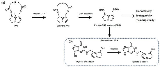 (a) Metabolic activation of PAs, the formation of PDA, and resultant genotoxicity, mutagenicity, and tumorigenicity. (b) The predominant PDA, pyrrole dG adduct, and its degradation product pyrrole-G adduct.