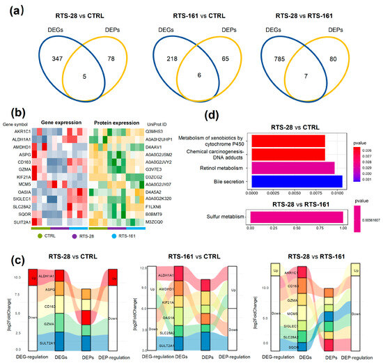 A KEGG pathway analysis was used to identify pathways for these coregulated DEGs and DEPs (Figure 4d). The results showed activation of the cytochrome P450-mediated xenobiotic metabolism, chemical carcinogenesis–DNA adducts, retinol metabolism, and bile secretion pathways in the RTS-28 group compared to the CTRL group, as evidenced by the transcriptomic and proteomic data. The sulfur metabolism pathway was also activated in the RTS-161 group when compared with the RTS-28 group.