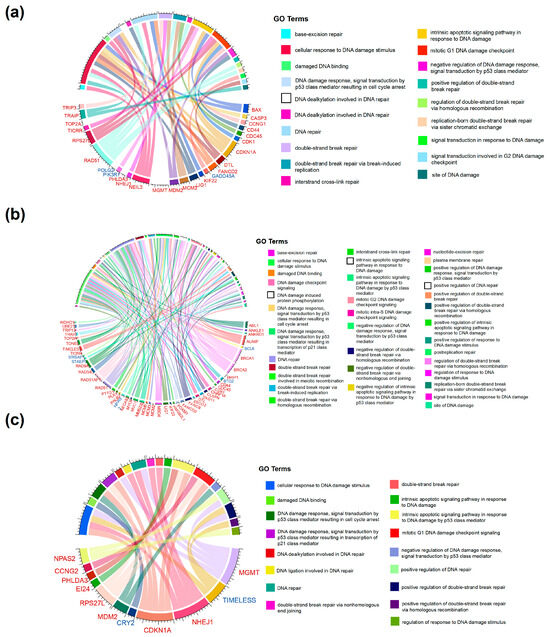 GO annotation classification analysis of DEGs related to DNA damage and DNA repair, divided into different comparison groups: (a) RTS-28 vs. CTRL, (b) RTS-161 vs. CTRL, and (c) RTS-161 vs. RTS-28. Data are expressed as mean ± SD (n = 4).