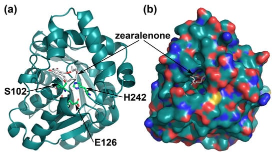 - Peng, W.; Ko, T.-P.; Yang, Y.; Zheng, Y.; Chen, C.-C.; Zhu, Z.; Huang, C.H.; Zeng, Y.F.; Huang, J.W.; Wang, A.H.; et al. Crystal structure and substrate-binding mode of the mycoestrogen-detoxifying lactonase ZHD from Clonostachys rosea. RSC Adv. 2014, 4, 62321–62325. [Google Scholar] [CrossRef]