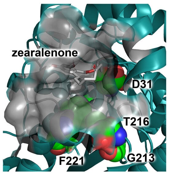 Location of the residues G213, T216, and F221 near the entrance to the pocket and the residue D31 at the bottom of the active center pocket of C. rosea ZHD. The substrate molecule (zearalenone) is shown in gray; the surface of the pocket of the active center is shown in transparent gray; the residues D31, G213, T216, and F221 are shown in green spheres, with nitrogen and oxygen atoms shown in blue and red, respectively.