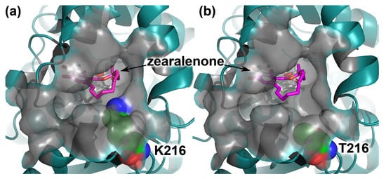 The tertiary structure of C. rosea ZHD with the T216K amino acid substitution (a) and the wild-type enzyme (b). The surface of the active center pocket is shown in transparent gray; the molecule of the substrate zearalenone is shown in gray and magenta for the modes at the bottom of the pocket and closer to the entrance to the pocket, respectively; the residues K216 and T216 are shown in green spheres, with nitrogen and oxygen atoms shown in blue and red, respectively.