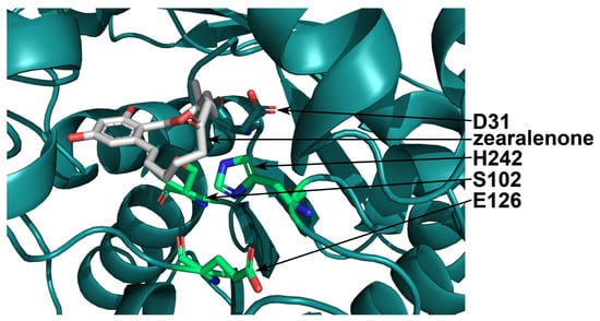 The structure of the complex of mutant zearalenone hydrolase from C. rosea with ZEA (PDB ID 3WZM) was used as a template for the docking optimization. Models of the wild-type enzyme and the variants with amino acid substitutions were used for docking a molecule of ZEA into the active center to calculate the affinity in an AutoDock Vina v. 1.2.1 program [43] as a part of the AMDock v. 1.5.2 software [44]. The search space for docking was centered on the catalytic residues S102, E126, and H242. The amino acid residues located near the catalytic residues S102, E126, and H242 in the tertiary structure of the enzyme were detected using a Swiss-PDBViewer v. 4.1.0 program [45].