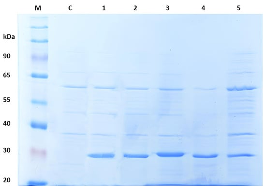 The E. coli Arctic Express strain was used to cultivate the cells that had been transformed with pNIC-ZHD plasmids encoding the native ZHD protein or one of four mutant variants (T216K, D31A, D31S, and D31N) of this protein. The cultivation medium was Terrific Broth supplemented with 50 μg/mL kanamycin. Following induction with isopropyl-β-D-thiogalactopyranoside (IPTG), the cultures were harvested and analyzed by SDS-PAGE (12.5% acrylamide/bisacrylamide), carried out under reducing conditions. Figure 6 displays a Coomassie-stained SDS-PAGE gel with recombinant ZHDs (rZHDs), with an approximate molecular weight of 30 kDa. Following the disruption of the bacterial cells by ultrasonication, the rZHDs were purified from the soluble fraction of the cell lysates using immobilized metal affinity chromatography (IMAC). The purification of the enzymes was achieved using a one-step chromatographic process that was consistent for all the rZHDs (see Section 4.4 for details).
