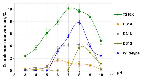 The variant D31S demonstrated a shift in its pH optimum to a more alkaline region. The variant D31S showed no ZEA-degrading activity at pH values below 7.0, and its activity at the optimum pH was twice as low as that of the wild-type enzyme.