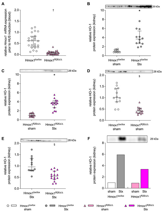 Hmox1 gene expression in the blood of Hmox1lox/lox and Hmox1R26Δ/Δ mice and heme oxygenase-1 (HO-1) protein expression in the kidneys of Hmox1lox/lox and Hmox1R26Δ/Δ mice with experimental hemolytic-uremic syndrome (HUS). (A) Relative Hmox1 expression in the blood of Hmox1lox/lox and Hmox1R26Δ/Δ mice prior to HUS induction (Hmox1lox/lox: n = 24 per group; Hmox1R26Δ/Δ: n = 30 per group). (B–E) HO-1 expression in the kidneys of Hmox1lox/lox and Hmox1R26Δ/Δ sham mice as well as Shiga toxin (Stx)-challenged Hmox1lox/lox and Hmox1R26Δ/Δ mice at day 7 after initial HUS induction (Hmox1lox/lox: n = 12 per group, Hmox1R26Δ/Δ: n = 15 per group): (B) renal HO-1 expression in Hmox1lox/lox sham and Stx-challenged Hmox1lox/lox mice; (C) renal HO-1 expression in Hmox1R26Δ/Δ sham and Stx-challenged Hmox1R26Δ/Δ mice; (D) renal HO-1 expression in Hmox1lox/lox and Hmox1R26Δ/Δ sham mice; (E) renal HO-1 expression in Stx-challenged Hmox1lox/lox and Hmox1R26Δ/Δ mice. (B–E) Data are presented relative to the mean of (B,D) Hmox1lox/lox sham mice, (C) Hmox1R26Δ/Δ sham mice and (E) Hmox1lox/lox Stx mice and are expressed as (A–E) scatter dot plots with median (interquartile range) for n observations. † p < 0.05 Hmox1lox/lox vs. Hmox1R26Δ/Δ, * p < 0.05 vs. corresponding sham group, $ p < 0.05 vs. Hmox1lox/lox sham group, § p < 0.05 vs. Hmox1lox/lox Stx group (Mann–Whitney U test). (F) For illustration, renal HO-1 protein expressions in pooled samples from all mice in all groups studied are shown relative to each other (pooled samples from Hmox1lox/lox sham mice (n = 12), Hmox1R26∆/∆ sham mice (n = 15), Stx-challenged Hmox1lox/lox mice (n = 12), Stx-challenged Hmox1R26Δ/Δ mice, (n = 15)). Data are presented as bar graph relative to the pooled Hmox1lox/lox sham group. No quantitative and thus statistical conclusions can be derived from this immunoblot, since the samples were pooled. All immunoblots are shown in larger format in the supplement (Supplementary Figure S1A–D).