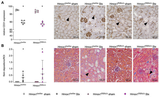 Renal thrombotic microangiopathy in Hmox1lox/lox and Hmox1R26Δ/Δ mice with experimental hemolytic-uremic syndrome (HUS). Quantification and representative pictures of (A) CD31 and (B) acid fuchsin orange G (SFOG) staining on day 7 in renal sections of Hmox1lox/lox and Hmox1R26Δ/Δ sham mice and Stx-challenged Hmox1lox/lox and Hmox1R26Δ/Δ mice (n = 5 per group). Arrowheads indicate (A) CD31-positive endothelial cells and (B) SFOG-positive areas indicative for fibrin deposition. Scale bars = 100 µm. Data are expressed as scatter dot plots with median (interquartile range) for n observations. * p < 0.05 vs. corresponding sham group (Mann–Whitney U test).