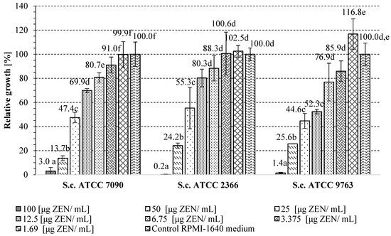 The effect of different doses of ZEN on the growth of studied S. cerevisiae yeast strains; a, b, c, …—mean values marked with the same letters do not differ significantly within results for each strain. Mean values were obtained based on results of at least 3 different cultures.
