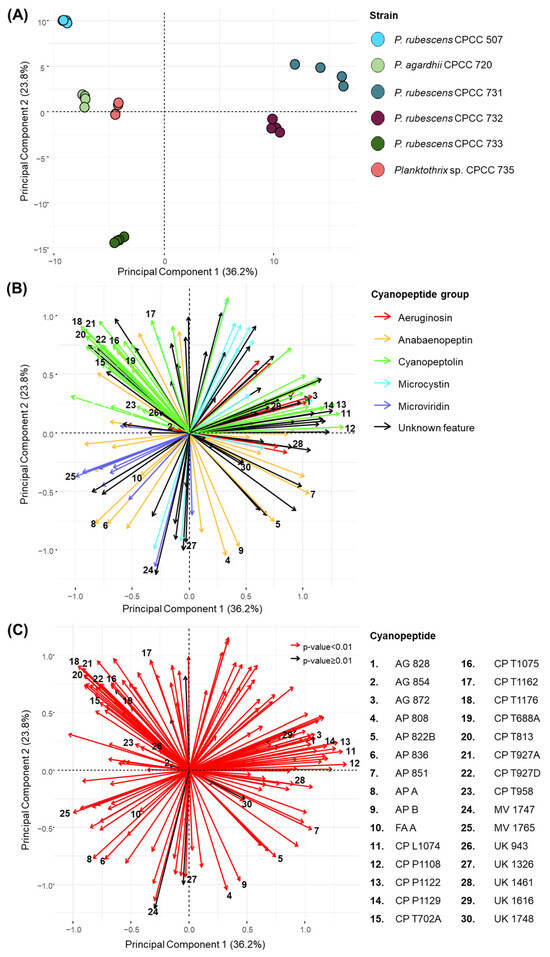 PCA (A) plot of intracellular features produced by quadruplicate cultures of the six Planktothrix strains. The loading plots show the 154 features considered in the PCA including 84 of the 225 cyanopeptides detected in this study. Cyanopeptide groups are colour coded in the middle loading plot (B). For loading plot (C), red vectors indicate statistical significance in contribution to variance of the studied Planktothrix strains considered in the PCA (p < 0.01, Kruskal–Wallis test with Benjamini–Hochberg correction); black vectors have no significant variation (p ≥ 0.01). Thirty features are labelled in (B,C) corresponding to the cyanopeptide legend.
