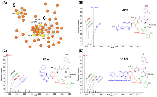 GNPS molecular network clusters 5 and 6 (A) showing anabaenopeptin diversity from studied Planktothrix (same colour coding as Figure 2). Cluster 5 shows anabaenopeptins with arginine at the exo-position whereas cluster 6 shows anabaenopeptins with several aromatic residues at the exo-position. For example, the MS/MS spectra for anabaenopeptin B (B) highlights cluster 5 and ferintoic acid A (C) and anabaenopeptin 856 (D) highlight cluster 6. Residue immonium and related ions were used to identify putative structures: m/z 84.0814 (Lys related ion; red), m/z 159.0908 (Trp; blue), m/z 175.1192 (Arg + 2H; blue), m/z 201.0985 (Arg-CO; blue), m/z 120.0809 (Phe; green), m/z 148.1117 (2-amino-5-phenylpentanoic acid; blue) and m/z 150.0910 (Hty; purple).