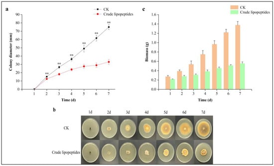 Inhibition of crude lipopeptides on the growth of A. alternata isolate H10 on PDA mediums after 7 days of incubation. (a) Diameter of mycelial growth within 7 days of incubation in the treatment and CK. (b) Mycelial growth in the treatment and CK group within 7 days of incubation. (c) Biomass of mycelial growth within 7 days of incubation in the treatment and CK. Asterisks indicate significant differences between treatments and CK (** p < 0.01). Mean ± SD, n ≥ 3.