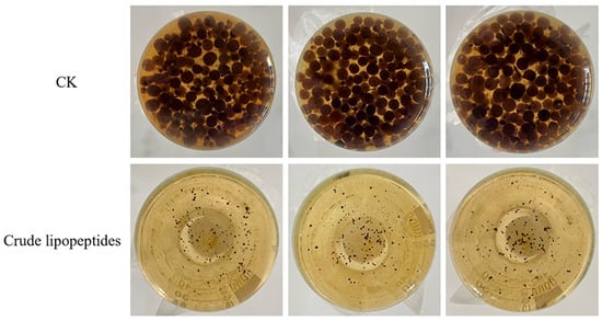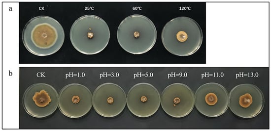 The method of Rong et al. was used with some modifications [43]. A total of 5 mL of crude lipopeptides was placed at various temperatures (25 °C, 60 °C, and 120 °C) for 1 h and then mixed with PDA in a ratio of 1:3. After solidification, A. alternata was put in the center and inoculated for 5 d at 28 °C. The effect of different temperature treatments of crude lipopeptides on A. alternata was detected by measuring the diameter of A. alternata. Three replicates were made in each group.