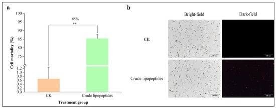 Effect of crude lipopeptides on the membrane integrity of A. alternata spore cells. (a) A. alternata spore cell membrane integrity. (b) PI staining of A. alternata spore cell membrane integrity. Asterisks indicate significant differences between treatments and CK (** p < 0.01). Mean ± SD, n ≥ 3.