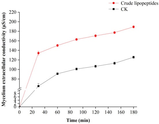 Sterile cellophane was carefully spread on the surface of the PDA medium, and then A. alternata was inoculated at 28 °C at the center of the medium above for 7 days. The cellophane was removed, and the mycelium on it was collected. Then, 0.25 g of mycelium and 5 mL of crude lipopeptides was added in a sterile centrifuge tube for incubation at 28 °C. The conductivity of the suspension was measured continuously with a conductivity meter at 0, 30, 60, 90, 120, 150 min, and 180 min, and the experiments were repeated three times.