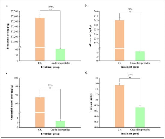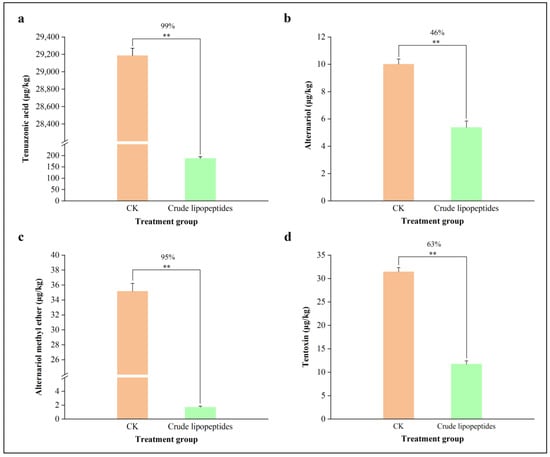 Inhibition of Alternaria toxins content by crude lipopeptides on PDB liquid medium. (a) TeA, (b) AOH, (c) AME, (d) TEN. Asterisks indicate significant differences between treatments and CK (** p < 0.01). Mean ± SD, n ≥ 3.