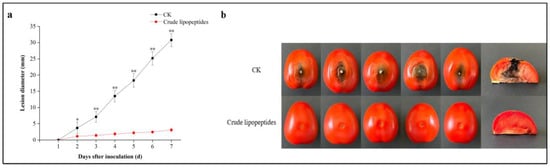 Anti-fungal potential of crude lipopeptides on tomato. (a) The lesion diameter in the treatment and CK during 7 days of storage. (b) The black spot disease symptoms in tomatoes in the treatment and CK at 7 days. Asterisks indicate significant differences between treatments and CK (* p < 0.05, ** p < 0.01). Mean ± SD, n ≥ 3.