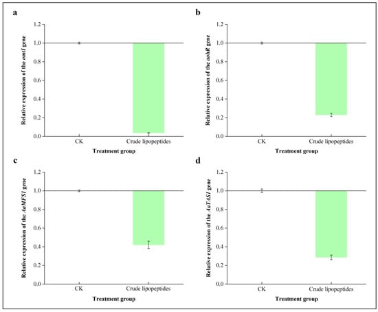 Effects of crude lipopeptides on the expressions of the critical genes involved in Alternaria toxins biosynthesis. (a) omtI, (b) aohR, (c) AaMFS1, (d) AaTAS1. Mean ± SD, n ≥ 3.