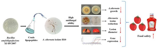 Collectively, the above results showed that crude lipopeptides have a significant inhibitory effect on A. alternata. Possible inhibitory pathways to Alternaria toxins of the crude lipopeptides were proposed as follows (Figure 11). The crude lipopeptides, extracted from B. amyloliquefaciens XJ-BV2007, had strong anti-fungal activity and significantly inhibited the growth of A. alternata isolate H10 on PDA, PDB, and tomatoes. It was shown the crude lipopeptides were capable of substantially inhibiting the morphology of A. alternata mycelial and spores via SEM analysis, in addition to damaging the integrity and permeability of the A. alternata isolate H10 cell membrane. Moreover, it also suppressed the expression of critical biosynthetic genes associated with Alternaria toxins, thereby inhibiting toxins production. Therefore, by inhibiting A. alternata growth and lowering its toxins level, B. amyloliquefaciens XJ-BV2007 and its crude lipopeptides could increase the safety of processing tomatoes that are prone to A. alternata contamination.