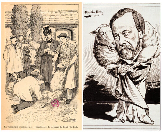 First anthrax vaccination in 1881 at Pouilly le Fort. (left) Emile Roux vaccinating sheep in the presence of Louis Pasteur. Drawing by J Girard, 1887. ©Institut Pasteur/Musée Pasteur. (right) Drawing by Alfred Le Petit in Le Charivari, 27 April 1882. https://gallica.bnf.fr/ark:/12148/bpt6k3073477c#, (accessed on 5 November 2023).