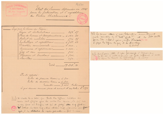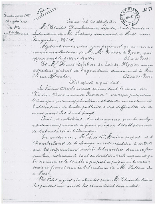The anthrax vaccine was distributed in many countries; the production was relocated to produce and distribute the vaccine directly on site. An interesting document gives some insights into this aspect. In 1886, a contract was signed between Charles Chamberland and Henri Lefebvre de Sainte Marie—defined as “député, sous-directeur, laboratoire de M. Pasteur” and “ancien inspecteur général de l’agriculture”, respectively; it aimed to entrust the production of the anthrax vaccine outside France (and its colonies) for 30 years (Figure 3). Some countries were excluded, as other exclusivity contracts were already running; these were Argentina, Paraguay, Uruguay, and Austria-Hungary. The selling prices were defined. In another instance, a little later (1888–1891), Louis Pasteur sent Adrien Loir, his nephew, to Australia to confirm that Cumberland disease, which affected cattle on this continent, was, in fact, anthrax. Adrien Loir then set up a vaccine production unit in Sydney [15].