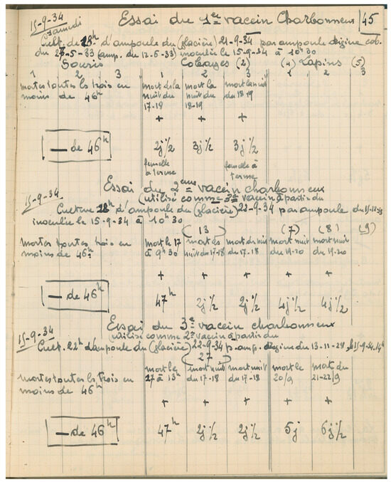 Anthrax vaccination usually required two to three inoculations of the attenuated vaccine strains with increasing virulence, with the “first vaccine” being the most attenuated; thus, so-called first, second, and, sometimes, third vaccines were produced, as is apparent from the laboratory notebooks (AIP SVV.1&2). Their degree of residual virulence was regularly tested in mice, guinea pigs, and rabbits, resulting in the modification of their use. For instance in an entry on 15 September 1934 (Figure 5): “trial of the second anthrax vaccine (used as third vaccine from 22 September 1934) … trial of the third anthrax vaccine (used as second vaccine from 22 September 1934)” or “second anthrax vaccine … too strong, to be used as third vaccine (vials labelled 23 April 1940)” (translation PLG).