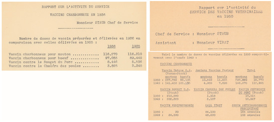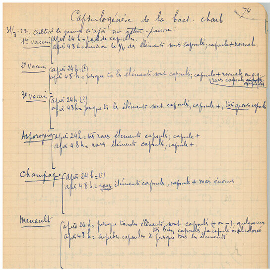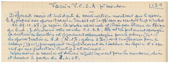 In the 1930s, unencapsulated strains were reported by Nicolas Stamatin in Romania and Max Sterne in South Africa [23,24,25]. When used for vaccination, these strains gave lower mortality/morbidity and were safer for use on cattle [26]. At the time, nobody understood the basis of this attenuation, as the plasmids had not yet been described. The Sterne strain arrived at Institut Pasteur on 29 December 1947 through André Staub (Figure 8, AIP SVV.1) and was tested for its protective efficiency [27]. No report considering its potential use as an alternative vaccine was found in the laboratory notebooks.