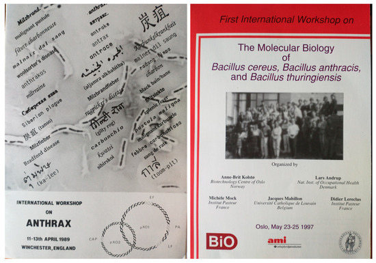 As mentioned above, the separation of the research activity from the diagnostics and vaccine activities at the beginning of the 1970s led to the interruption of research on B. anthracis at Institut Pasteur. Work on B. anthracis was revived from 1986 onwards at Institut Pasteur by Michèle Mock, a scientist at the CNRS, a national French research organisation (Centre National de la Recherche Scientifique). During her doctoral and post-doctoral formation, she specialised in colicins, which can be considered plasmid-borne bacterial toxins that are directed against other bacteria [54]. Her postdoctoral training in John Collier’s “toxin” laboratory (then in Los Angeles) made her fluent in the new techniques in molecular biology such as cloning and sequencing among many others [55]. The period was, indeed, blooming with new technologies in molecular biology. This was also applied to B. anthracis, hence the discovery of the genetic substratum of the toxins; the pXO1 “toxin plasmid” was first described in 1983 [12] and the “capsule plasmid” in 1985 [13,14], paving the way for future avenues of research.
