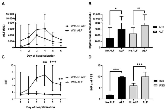 Changes in hepatic transaminases, INR, and poison severity scores (PSSs) in patients with suspected Amanita phalloides intoxication. (A) ALT concentrations and (C) INR over time in patients without or with acute liver failure (ALF). (B) Maximum AST and ALT and (D) maximum INR and PSS values in patients without and with ALF during hospitalization. Data represent medians and ranges of 22 patients without ALF and 6 patients with ALF. * p < 0.05, ** p < 0.01, *** p < 0.001, ns not statistically significant.