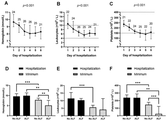 Finally, platelet cell count decreased significantly during hospitalization to values around the lower reference limit (p < 0.001, Figure 2C). No effect was observed on the platelet large cell ratio (Supplementary Table S1). No differences in platelet counts were observed at hospitalization in patients with ALF compared to those without ALF, while minimum platelet counts were clearly lower in patients with ALF than in patients without ALF (p < 0.001, Figure 2F).