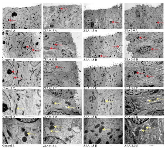 The result of the ultrastructure of uterine endometrial epithelium showed that the nucleolus is obvious, the nuclear membrane boundary and mitochondrial inner spine are clear in the control group (Figure 2; Control A~C; red arrow), and there is vacuolation of the endoplasmic reticulum occasionally (yellow arrow). In the treatment group, the number of nucleoli increased, and the boundaries were blurred (ZEN 0.15 A~C, ZEN 1.5 A~C, ZEN 3.0 A~C; red arrows). Under 25,000 and 50,000 times of microscopy, the endoplasmic reticulum was seriously vacuolated, and the organelle structure was damaged irregularly (ZEN 0.15 D~E, ZEN 1.5 D~E, ZEN 3.0 D~E; yellow arrows). In addition, we found that cells in the ZEN 0.15 and ZEN 1.5 groups had multiple nucleoli, while the ZEN 3.0 group had the largest number of cells with multiple nucleoli.