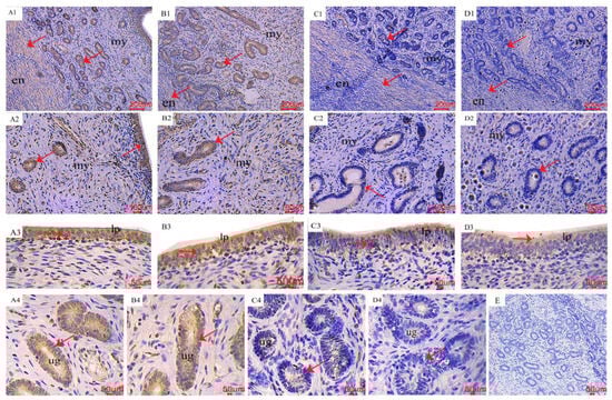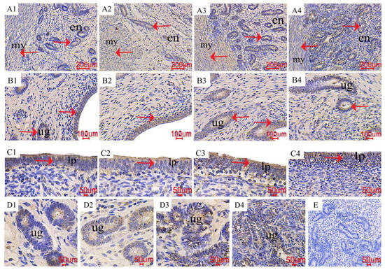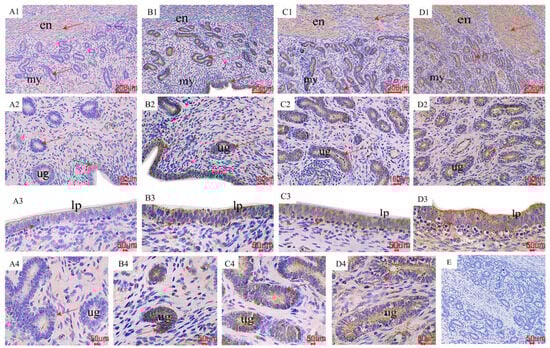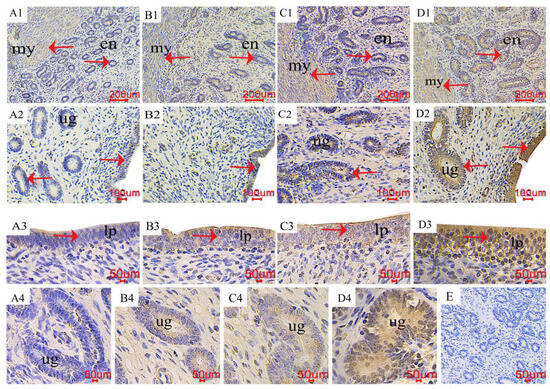 Effects of ZEA on the Beclin1 localization of the uterus in gilts. The “en”, “my”, “lp”, and “ug” represent the endometrium, myometrium, lamina propria, and uterine gland, respectively. (A–D) represent the control diet with an addition of 0, 0.15, 1.5, and 3.0 mg·kg−1 ZEA. (E) was the negative control.