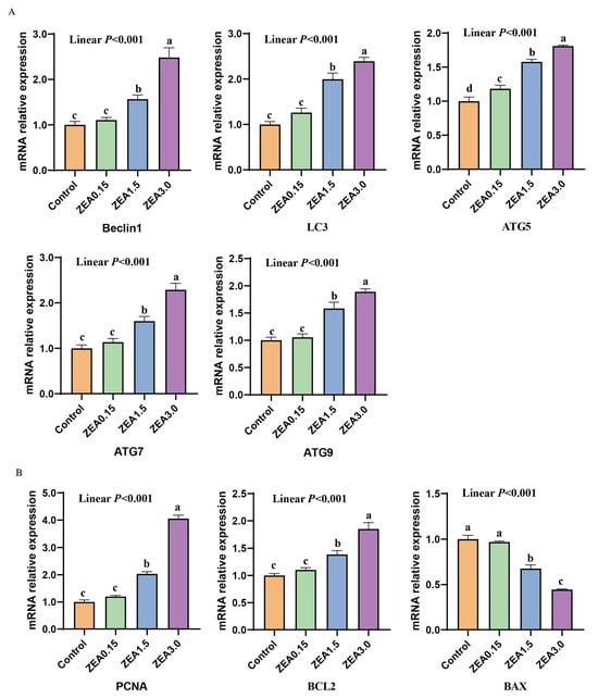 Effect of ZEA on the relative mRNA expression of (A) autophagy and (B) proliferation apoptosis-related genes. Control, ZEA0.15, ZEA1.5, and ZEA3.0 represent the control diet with an addition of 0, 0.15, 1.5, and 3.0 mg·kg−1 ZEA. Values with different letter superscripts mean significant difference (p < 0.05), while with same letter superscripts mean no significant difference (p > 0.05).