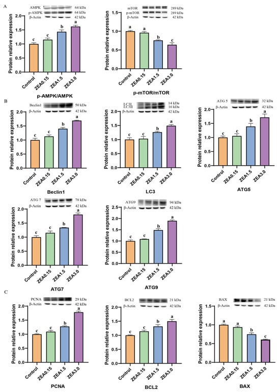 Effect of ZEA on the relative protein expression of (A) p-AMPK/AMPK and p-mTOR/mTOR, (B) autophagy, and (C) proliferation apoptosis-related genes. Control, ZEA0.15, ZEA1.5, and ZEA3.0 represent the control diet with an addition of 0, 0.15, 1.5, and 3.0 mg·kg−1 ZEA. Values with different letter superscripts mean significant difference (p < 0.05), while with same letter superscripts mean no significant difference (p > 0.05).